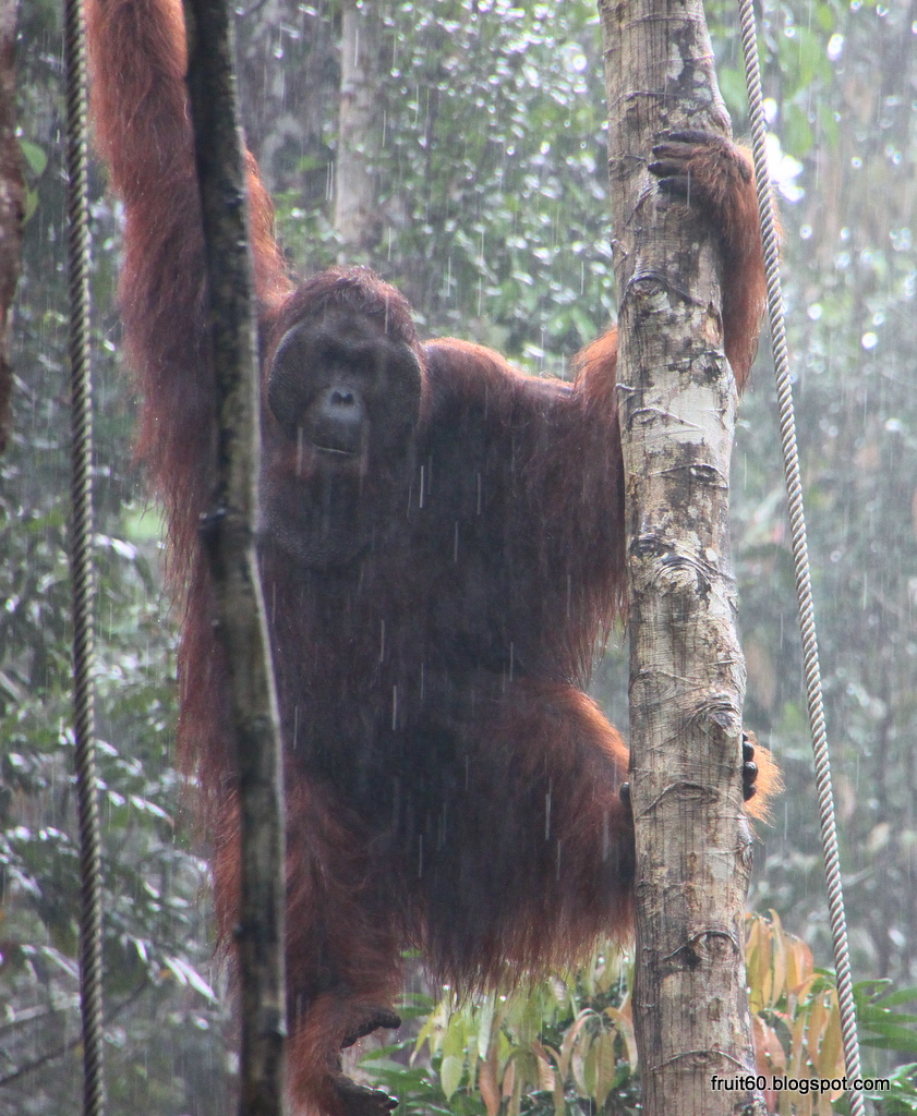 So we trudged through a short stretch of forest to the feeding sight (along with about 40 other people) and waited. The park rangers were doing their tarzan type calling to get the apes attention, but as time went by it looked like they weren't coming. The rangers explained to the visitors that 4 orangutans were out near the park entrance, where they also put out food, so most people wandered back off that way. We stayed and hoped for the best. The sky by this time was getting blacker and blacker and the first spots of rain were falling. Visiting time is only an hour and we were approaching 40 minutes by this time. Then, we saw signs of movement high up to our left and what looked like a mother and child stared to make their way down to the feeding sight. The heavens of course chose this exact moment to really open up, and rain poured out of the sky like it does in tropical equatorial countries...i.e. very heavily. Then.....the trees in front of us starting to move like an elephant was barging its way through them... and we got out first sighting of the alpha male...Ritchie.